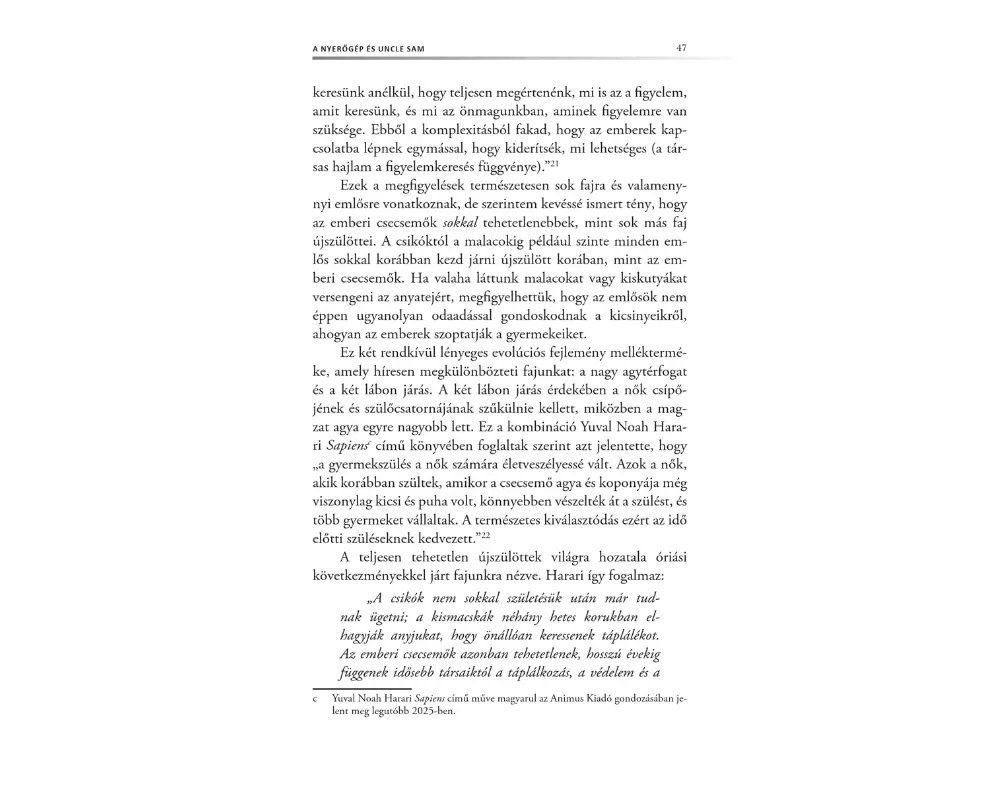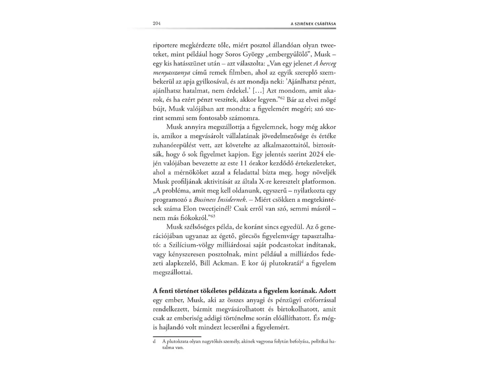 Mindannyian érezzük a szétszórtságot, koncentrációnk romlását, hogy túl hosszú ideig – függőség határait súrolva – figyelünk értelmetlen dolgokra. Az utcán összefutunk a telefonjukat bámuló zombikkal, máskor mi magunk is azok vagyunk. Szánalommal figyelünk négy embert egy éttermi asztalnál, akik mind a mobiljukat bújják, miközben a mi zsebünk is rezeg. Valami teljesen megváltozott: az emberi történelem nagy részében a köz- és a magánszféra határai egyértelműek voltak, legalábbis elméletben. Most, ahogy a szerző írja: „Néhány technológiai cég segítségével gyakorlatilag egy évtized alatt lebontottuk ezt a határt.” Hayes szerint egy korszakot meghatározó átalakulás közepén vagyunk: a figyelem egy árucikké vált erőforrás lett, amelyet kinyernek belőlünk, és amelytől egyre inkább elidegenedünk.